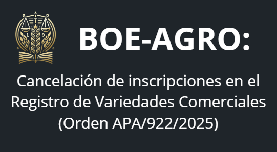 El Ministerio de Agricultura, Pesca y Alimentación aprueba la Orden APA/922/2025 (13 de agosto) por la que se cancela la inscripción de diversas variedades en el Registro de Variedades Comerciales, con efectos desde el día siguiente a su publicación en el BOE. La orden remite a los artículos 51 y 52 del Real Decreto 170/2011 (Reglamento General del Registro) como fundamento de la cancelación. Para el sector, implica actualizar catálogos, planificaciones de producción y documentación de venta de material vegetal, ya que las variedades afectadas dejan de poder comercializarse como material certificado en España.